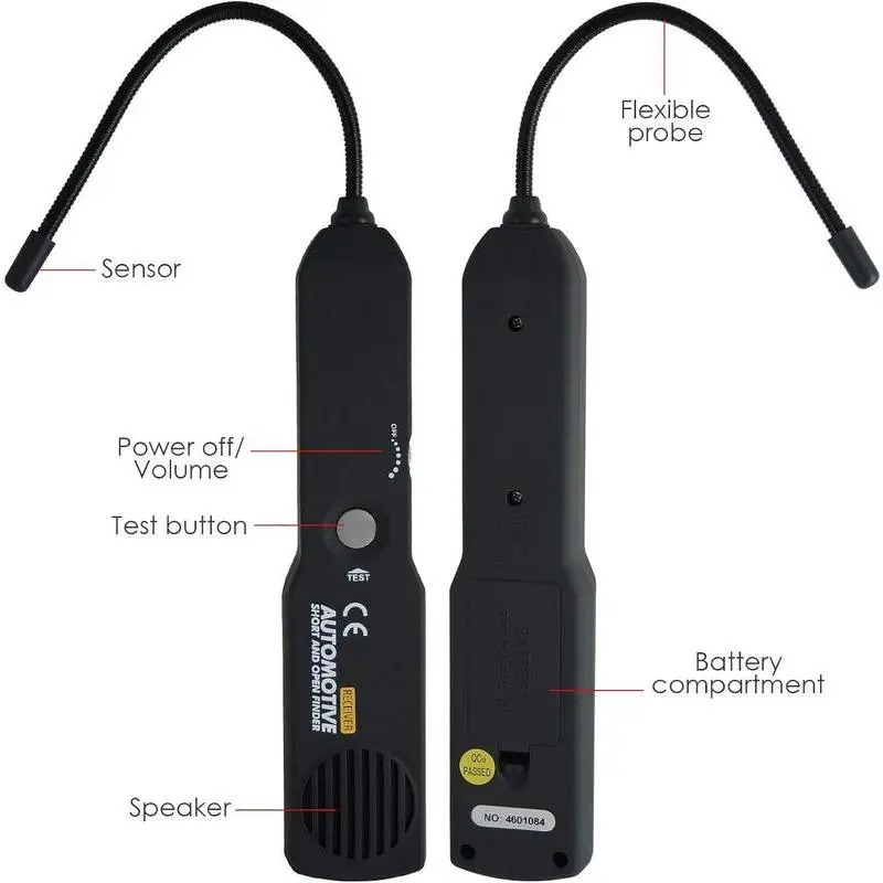 This advanced circuit finder lets you trace, test, and troubleshoot without ever piercing the insulation. The flexible probe bends into tight spaces — doors, dashboards, engine bays — while adjustable sensitivity ensures reads in any environment. Follow the LEDs and beeps straight to the problem.